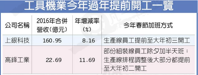 臺灣工具機業過去幾年包括上銀科技、程泰、亞崴、臺中精機、永進、友嘉、遠東機械、東臺、臺灣瀧澤科技及高鋒等工具機廠及零件業,為了趕急單,即使遇到過年生產線也照樣排班不停工;但今年一例一休上路,員工加班不單要支付2倍薪資,零件業僅上銀及大銀微系統加班趕工,工具機廠目前也僅高鋒提前開工,其他廠商普遍選擇大年初六恢復上班,年節提前開工不如往年熱絡。