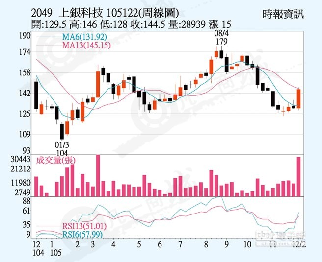 上周,在外資持續買超帶動下,上銀科技終場股價上漲3.5元、收144.5元,一舉突破周線、月線及季線反壓套牢區,股價周漲幅11.58%。