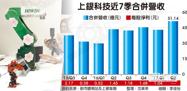 全球吹起工業(yè)4.0風潮,對智慧自動化設備及機器人需求殷切,全球景氣又逐步回升,帶旺上銀(2049)6月合并營收攀升至17.71億元,創(chuàng)單月新高;第2季營收創(chuàng)單季新高,上半年營收也創(chuàng)同期新高,表現(xiàn)優(yōu)于預期。上銀年底前訂單滿載,目前接單到出貨至少要等半年時間。