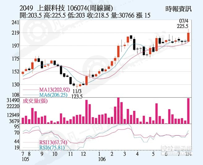 因今年工具機產業景氣好轉、大陸對自動化設備及機器人需求持續增溫,上銀年底前訂單滿載,全年合并營收有機會續創歷史新高,上周五自營商雖賣出,承接買盤強勁,呈價穩量縮走勢,上漲1.5元而以218.5元作收,創2015年7月以來新高,周漲幅7.37%。