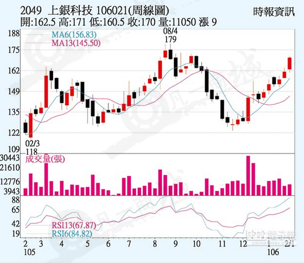 上銀大廠(2049)因滾珠螺桿、直線導(dǎo)軌及機(jī)器人三大主力產(chǎn)品,17年首季訂單因大陸對智慧自動化設(shè)備及機(jī)器人需求增溫而滿載,開始接第2季訂單,今年合并營收要挑戰(zhàn)200億元目標(biāo),上周五三大法人聯(lián)手買超1,599張,股價上漲7.5元、收170元,周漲幅5.59%。