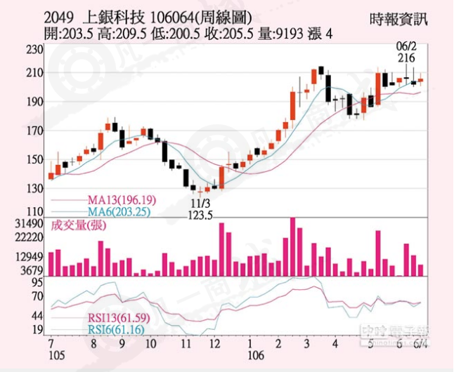上銀(2049)滾珠絲桿、直線導(dǎo)軌及機(jī)器人三大主力商品年底前訂單滿載,法人預(yù)期,第2季合并營(yíng)收挑戰(zhàn)50億元,6月新臺(tái)幣匯率回貶,第2季營(yíng)收及獲利可望優(yōu)于第1季,三大法人上周五合計(jì)買超397張,激勵(lì)股價(jià)上漲1元、收205.5元,單周漲幅1.99%。