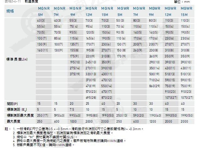 微型上銀導軌MGN/MGW系列備有滑軌標準長度庫存,以供應客戶需求。若客戶訂購非標準長度滑軌時,端面距離E的尺寸,最好不要大于1/2P,防止因E的尺寸過大,導致滑軌裝配后端部的不穩定,而降低線性滑軌的精度,亦不可取用過小的E值 (小)以避免螺栓孔破孔。