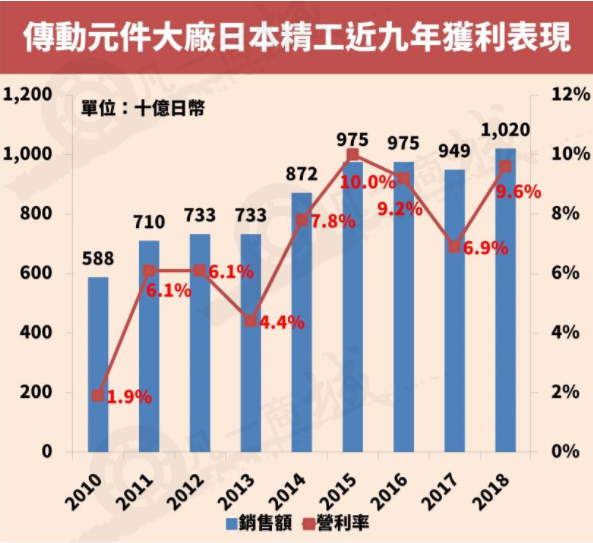以日本精工來說,除了生產汽車傳動零組件外,也是目前世界上傳動組件市占率最高的公司。2018年營收預計突破一兆日幣,其中單靠生產機械設備用傳動組件就賺進了近三千億日幣,里面有63.5%是來自海外訂單。