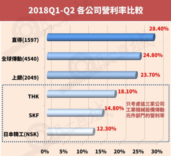 以和業務較專一的臺灣廠商做比較,結果發現在生產類似的產品上,臺灣廠商的營利率表現比 THK、NSK、SKF 還來的好。