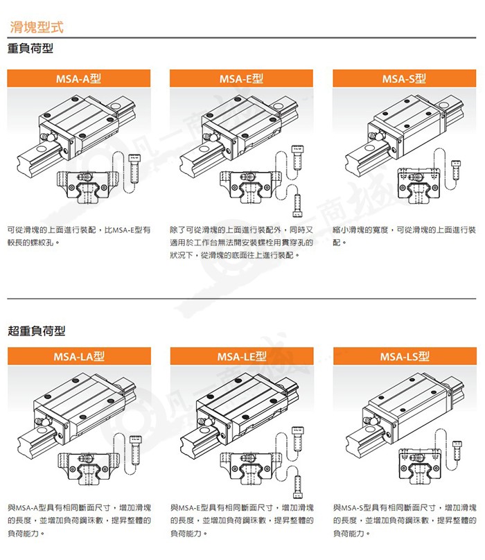 5、MSA型是高組裝滑座型式;E:有法蘭螺紋型滑塊;LE:有法蘭螺紋加長型滑塊;S:方型螺紋型滑塊;LS:方型螺紋加長型滑塊。