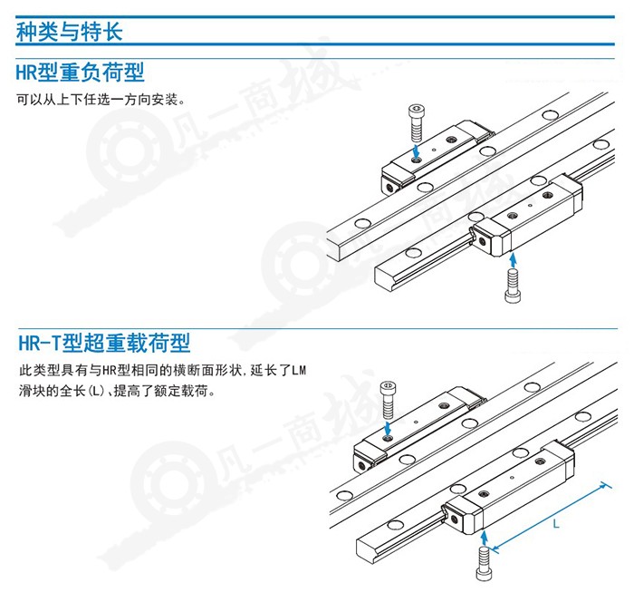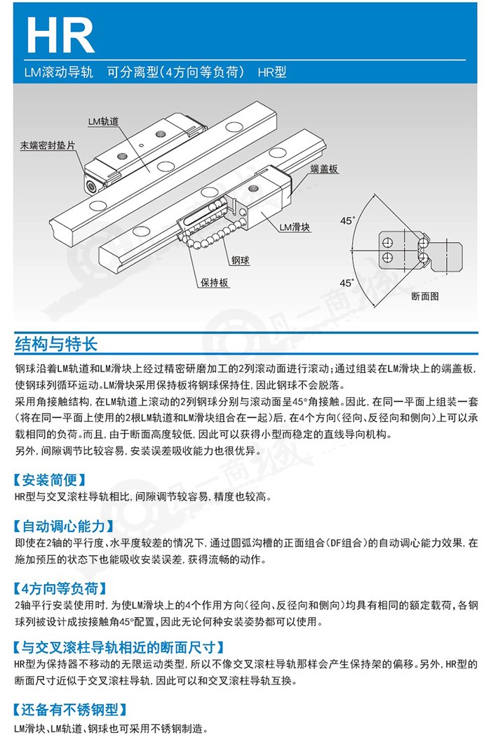 HR型為保持器不移動的無限運動類型,所以不像交叉滾柱導(dǎo)軌那樣會產(chǎn)生保持架的偏移。另外,HR型的斷面尺寸近似于交叉滾柱導(dǎo)軌,因此可以和交叉滾柱導(dǎo)軌互換。