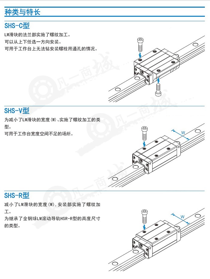 SHS-V型:為減小了LM滑塊的寬度(W),實施了螺紋加工的類型,可用于工作臺寬度空間不足的場所.